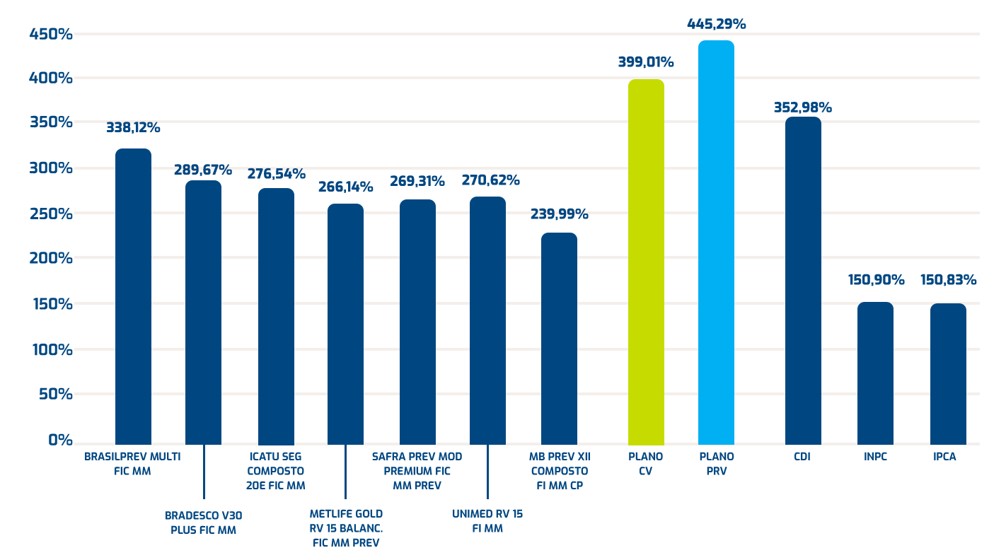 Já no Plano PRV, essa rentabilidade é agregada ao patrimônio total do plano, devido à caraterística mutualista.